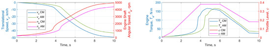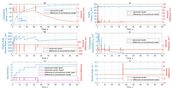 Figure 10, despite the similarity of the speed and engine revolution curves, the main discrepancies in kinematics are caused by the relative lag of the advanced model (AM) torque, compared to the conventional model (CM). Such a picture shows that the conventional model’s sensitivity at low powers is higher than that of the advanced one, which is caused, to a greater extent, by the transient processes.