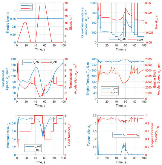 Note that the torque level remains approximately constant and fits the established fuel supply pattern. The engine uses a range of 3000–6000 rpm, which corresponds, on the one hand, to the operation by engine’s partial power characteristic and, on the other hand, to the frequency offset to a range of higher torque. Note that both the conventional (CM) and advanced (AM) models show a high coherence, with minor differences in this test; therefore, the results are presented only for the AM variant. This test’s primary purpose is to demonstrate the stability of the proposed control algorithm, in general, when the automatic drivetrain adaptation can be provided. The gearbox logic may both down- and upshift, quickly returning to a state of higher gears and speeds without throttle manipulation.