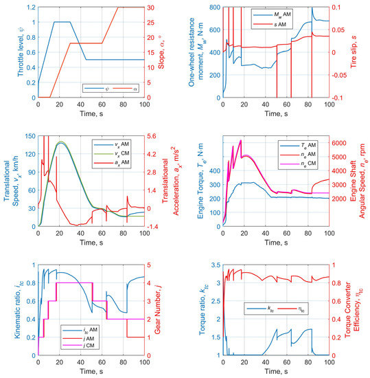 The speed change nature entirely agrees with the combined factors of the control and load. The outputs of both models are identical in tendency, but with some differences. Thus, the fuel supply decrease from the 30th s, followed by the slope angle increase, leads to an intensive downshifting up to the 1st gear in the AM case and 2nd gear in the CM case. At the same time, the AM continued to accelerate slightly, while CM stabilized its speed. Note that, between the 35th and 85th s, the torque converter is intensively included in the work, with an augmenting torque ratio up to 1.7, which reduces gears and provides a significant growth of the total transmission ratio. It is additionally worth noting that the engine torque shape matches the form of the accelerator control law and speed change tendency, which also indicates the control stability, depending on the driving mode.