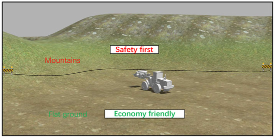 Over the past several decades, the operation strategies aiming to increase mobile machines’ holistic efficiency receive much attention. As Osinenko pointed out, the engine power of farm tractors is growing at 1.8 kW per year and has reached about 500 KW for the most powerful traction class [1], indicating the great potential to increase the holistic efficiency of the machines. Current solutions to optimize the system can be concluded as two kinds. To overcome the extreme conditions, the basic idea of the first method is equipping the mobile machines with an energy-saving system [2,3,4], such as accumulators. The other one is based on a dramatic controller to increase the dispensable power in a short period [5,6,7,8,9,10]. However, due to safety reasons, most of the operation strategies of mobile machines are designed conservatively. For instance, the energy-saving equipment should always at a relatively high level, and the controller must be designed to have rapid responses. As a result of that, the machines are still very likely to work in suboptimal areas. In the previous studies, most of them utilize the intrinsic signals to optimize the system [11] since the environmental information is hardware or computationally expensive to be gathered. However, the environment also has an essential influence on the system, i.e., to perform tasks both efficiently and safely, the construction machines shall be optimized by knowing their location and surroundings; thus, we proposed a method that can generate the map information surrounding the mobile machines only with affordable sensors so that provides the possibility to improve the system further. The basic idea of our approach is to generate the map information of the working site based on the vehicle position, rolling resistance, as well as road grade. Concretely, a special recursive least square with forgetting algorithm is used to record the road grade and the rolling resistance in realtime [12,13]. This information will be saved together with the localization information. Consequently, after the machine passes by, it will record the information about that place. Since the mobile machines are driving repeatably for a special task, the method can be expected to work well even when the map information does not cover most of the working site. Figure 1 illustrates the motivation of our approach.
