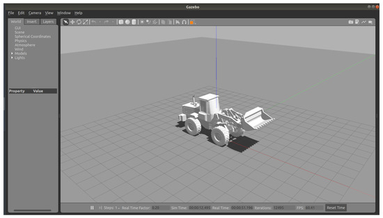 Wheel loader model in Gazebo: once the models had been developed in Solidwork, they were converted to Unified Robotic Description Format (URDF), using a 3rd party URDF conversion tool called “sw_urdf_exporter”, which allows for conveniently exporting SW Parts and Assemblies into a URDF file. Gazebo enables us to obtain sensors’ simulation such as IMUs, GPSs, encoders, cameras, and stereo cameras through gazebo_plugins, which can be used to attach into ROS messages and service calling the sensor outputs, i.e., the gazebo_plugins create a complete interface (Topic) between ROS and Gazebo.