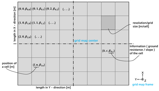 Our approach uses multilayered grid maps to store data for different types of information. Concretely, every grid saves a matrix including location information and resistance or grade, depending on which layer it is. A grid with site information will be created after the vehicle passes by. The map is saved as a tensor, where m is the max displacement in the x-direction, while n is the max displacement in the y-direction. In case a grid is not occupied once by the vehicle, it will be marked as NaN to denote the unknown regions.