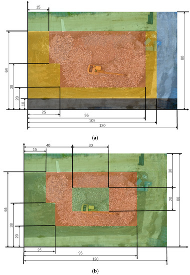 The ground truth map with dimensions. The simulation environment we used in Gazebo was modeled based on a real construction site, and the parameters are selected according to material characteristics. Since simulating a small construction site may cause system error and thus lack plausibility, we augmented this real construction site’s dimensions in Gazebo. (a) Example construction site divided into five areas according to different ground resistances; (b) Example construction site divided into two areas according to different slopes.