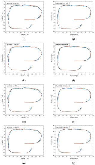 In the correction step, the measurement model integrates sensor data to update the predicted state. GPS provides position information, and wheel encoders provide velocity information for the correction. Moreover, the orientation, velocity, and acceleration information are updated from IMUs via gyroscopes and accelerometers. Furthermore, the process model and measurement model also need to add a noise covariance matrix, Q and R, respectively. The noise matrices can generate uncertainty in the system. The process matrix contributes to the overall uncertainty in the algorithm, which adds to the process model. Intuitively, a large value in the Q matrix means a considerable uncertainty in the process model, causing the system to have greater confidence in the measurement data. In the current implementation, the process noise matrix was set as a diagonal matrix. The state variables, which are directly measured by the sensors, such as x y position by GPS and orientation by IMUs, were set relatively small. The variables, which were not directly measured, could be updated from the measured data. The measurement covariance matrix R corresponding to the confidence in the sensor data. Similarly, the greater the noise in the elements of this matrix, the less confidence in the measurement data. The measurement covariances are derived by the sensors noisy.