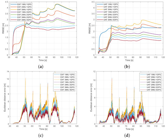 Quantitative evaluation of different methods. Here (a) RMSE of EKF and (b) RMSE of UKF show the accumulative error, i.e., RMSE, while (c) Euclidean distance error of EKF and (d) Euclidean distance error of UKF demonstrate the current Euclidean distance error of each sensor arrangement. There are some noticeable instantaneous position changes every ten seconds due to infrequent GPS signal loss. Generally, UKF shows better performance than EKF for both RMSE and Euclidean distance error.