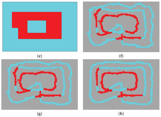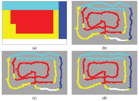 To evaluate the plotted maps’ accuracy, we used Matlab to implement an algorithm to compare the predefined area and the plotted path the mobile machine traveled. Figure 10 graphically illustrates the mispredicted grid point with white color, where the mispredicted points are generally distributed in the marginal zone. This is because even the localization technology makes some mistakes; the problem is unlikely to cause an error as long as the vehicle is not at the very edge of different zones, indicating the robustness of this mapping idea of the construction site.