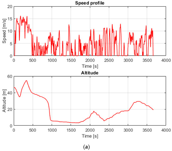 The state of charge of the batteries was managed by a control system that switched the generator on or off in function of the driving cycle request. The control strategy was designed so that the vehicle had a residual state of charge of approximately 40% at the end of the driving cycle, in order not to damage the batteries. In order to consider a complete charge/discharge cycle of the batteries, until the same state of charge was achieved at the end of the driving cycle, so as to calculate fuel consumption of the HEV, the highlighted time laps in Figure 12 were considered.