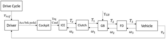 The mathematical model of the conventional vehicle was based on longitudinal vehicle dynamics and the model allowed a feed-forward approach, as shown in Figure 6.