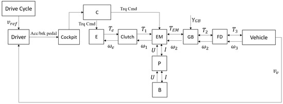For the HEV, the modelling followed a feed-forward approach, as shown in Figure 8.