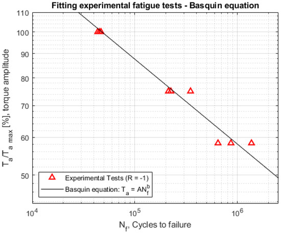 Equation (1) also means that . The experimental results allowed the obtaining of the Ta-N curve (torque amplitude-number of cycles) of the mechanical component. In addition, it was necessary to fit the experimental tests to have a linear trend in a bi-logarithmic diagram, also called the Wöhler diagram [35]. Linear fitting was performed using the Basquin equation [38,39], defined in Equation (4):