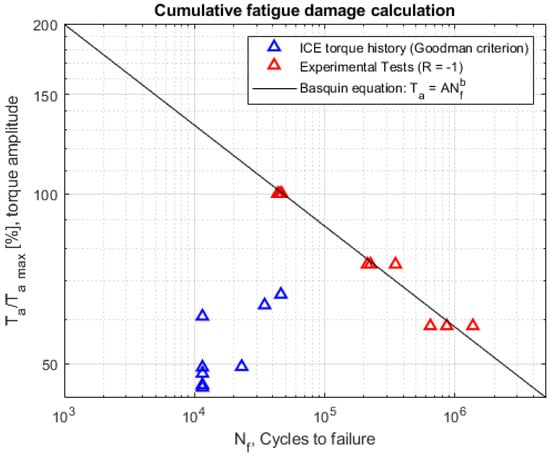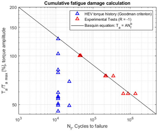 - Experimental data of the component. In this case, it was necessary, through the Rainflow method [33], to extract an equivalent load cycle in terms of stress amplitude (or, in this case, torque amplitude) and the number of cycles. Then, it was necessary to obtain an equivalent load history at load ratio R = −1, using the Goodman criterion [34]. This was done because it is common practice to test the component [32] or the material component [35] at constant amplitude. Finally, the cumulative fatigue damage was evaluated using the Palmgren-Miner criterion [36].