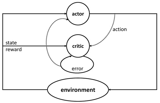 Here, denotes the learning rate. Algorithms that follow this approach are generally referred to as policy gradient methods and belong to the category of exclusively policy-based actor variants [36]. Since a pure policy method requires significantly fewer parameters than a value function, the use of an actor method can be advantageous [37]. These approaches can be extended to include value functions; consequently, they are referred to as actor–critic methods. Figure 2 illustrates the learning flow in these methods [38].