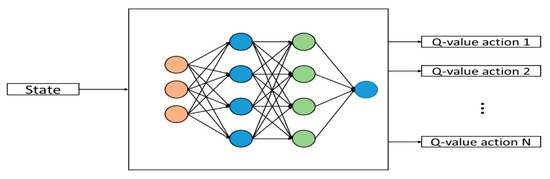 To address the mentioned problem of large state spaces, function approximators are used as in deep Q-learning (DQL). In this case, no table was built, but the parameters of a neural network (NN) were optimized to maximize the expected long-term reward. Figure 3 illustrates DQL using an NN to approximate a function [41]. Here, the state was given as an input to the NN. The outputs of the system were the Q-values of all possible actions.