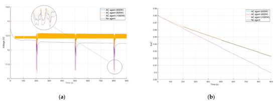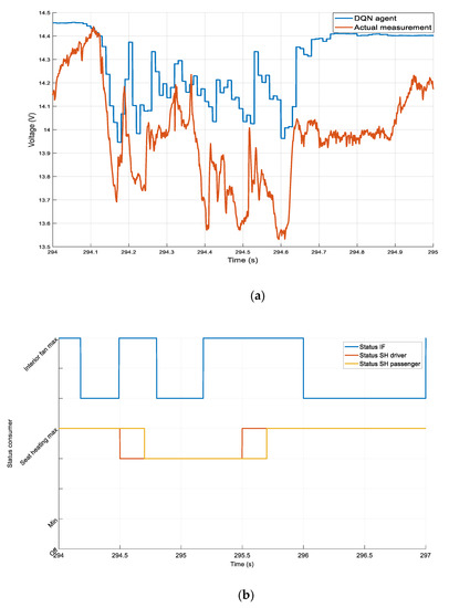 The increasing electrification in motor vehicles in recent decades can be attributed to higher comfort and safety demands. Strong steering and braking maneuvers reduce the vehicle’s electrical system voltage, which causes the vehicle electrical system voltage to drop below a critical voltage level. A sophisticated electrical energy management system (EEMS) is needed to coordinate the power flows within a 12-volt electrical system. To prevent the voltage supply from being insufficient for safety-critical consumers in such a case, the power consumption of several comfort consumers can be reduced or switched off completely. Rule-based (RB) energy management strategies are often used for this purpose, as they are easy to implement. However, this approach is subject to the limitation that it is vehicle-model-specific. For this reason, deep reinforcement learning (DRL) is used in the present work, which can intervene in a 12-volt electrical system, regardless of the type of vehicle, to ensure safety functions. A simulation-based study with a comprehensive model of a vehicle electric power system is conducted to show that the DRL-based strategy satisfies the main requirements of an actual vehicle. This method is tested in a simulation environment during driving scenarios that are critical for the system’s voltage stability. Finally, this is compared with the rule-based energy management system using actual vehicle measurements. Concluding measurements reveal that this method is able to increase the voltage at the most critical position of the 12-volt electrical system by approximately 0.6 V.