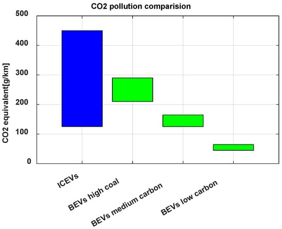 CO2 pollution comparison between ICE Vehicles (ICEVs) and Battery Electric Vehicles (BEVs) [].