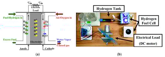 Fuel cells, as well as batteries, are electrochemical power sources that produce electricity by combining a fuel (electroactive material) and an oxidant. The main difference between batteries and fuel cells is that the active materials for fuel cells are provided from an external source that is not an integral part of the device as in batteries. Therefore, a fuel cell can generate electrical energy as long as the active materials are provided [,,]. Based on the types of fuel, fuel cells are classified into two categories: Proton Exchange Membrane (PEM) Fuel Cell and Solid Oxide Fuel Cell (SOFC) [].
