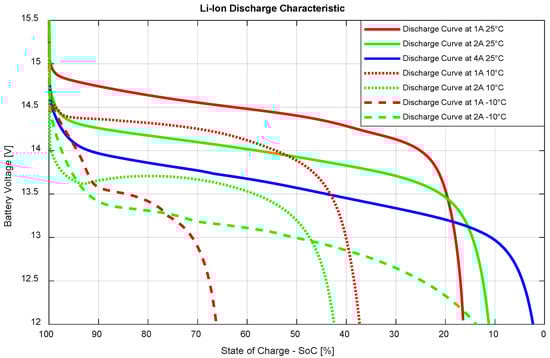The OCV method predicts the SoC of a Lithium battery by measuring its open circuit and comparing it with the discharge curve . Figure 7 presents the typical discharge characteristics of Lithium batteries and shows the discharge curve depends on discharge current and temperature. Therefore, it is impossible to achieve a precise discharge characteristic for estimation. In addition, the OCV method requires the battery to be disconnected from the external circuit. For these reasons, the OCV method is not chosen for the designed BMS.