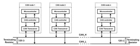 Controlled Area Network (CAN bus) is a massage-based communication protocol which is developed for the in-vehicle network in 1983 [,,,,]. CAN bus network is a highly reliable, inexpensive, and real-time network that allows multiple CAN devices to communicate with each other. With an uncomplicated structure, as shown in Figure 8, CAN system has great advantages regarding flexibility, ability to extend, and wiring cost [,]. In the automotive industry, CAN bus is one of the most common protocols for vehicle monitoring and controlling systems []. Besides this, CAN bus is an excellent choice for electrical work and communication in harsh environments [,]. The use of CAN bus; therefore, has been continuing to increase in other industries, such as aerospace, robotics, and automation instrumentation []. Due to these advantages, the CAN bus is chosen as one of the communication protocols used in our design. As shown in Figure 8, each CAN node contains a microcontroller, CAN controller, and CAN transceiver. In some microcontroller families, for example, the ESP32 family, the CAN controller is an integral part of the microcontroller. However, other microcontroller families, for example, the AVR Atmega 328 family, do not have an integrated CAN controller but require an external one.