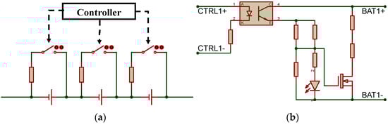 Obviously, an active balancer has higher efficiency since there is no thermal power loss. However, the active balancer requires a more complex control algorithm and more complex electronic circuit, resulting in higher cost and longer time to develop [,,]. Therefore, the passive topology of the balancer is chosen for our design. The passive balancer uses Shunting resistors to balance the cell voltage. Figure 10 also shows two methods of passive balancer.