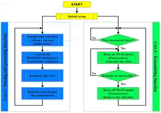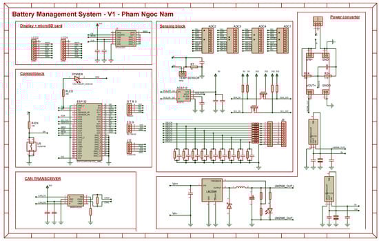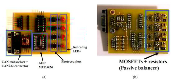 The designed BMS is actually a Commercial off-the-shelf (COTS) system, which is based on a microcontroller and common ICs such as ADCs, linear and switching regulators, and current and temperature sensors. Such a design allows easy, cheap, and fast manufacturing, maintenance, repair, or upgrading. In this period of chip shortage, such a COTS design is one of the most promising solutions [] because the concept of the designed system can be applied to almost types of microcontrollers, ADCs, sensors, etc.
