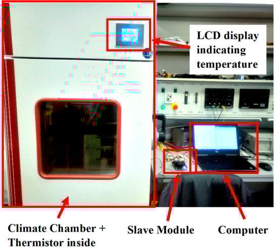 Dependence of the temperature T (in Kelvin) on the thermistor’s resistance R is given by Equation (3), where R0 is reference resistance (resistance of the thermistor at 25 °C), A, B, C, D are temperature coefficients.