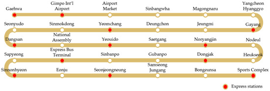 One of the purposes of mass transportation is to transfer the passengers to their destinations as fast as possible. In order to cope with this situation efficiently, several policies tend to be applied for mass transportation systems, such as the bus rapid transit and transfer systems among the other means of mass transportation. In this study, the dual operation policy for the electric tram system is investigated by considering the features of the wireless charging technology. The dual operation policy describes the different types of operations among the trams, which are operated on the same route. Suppose that there is an express operation and a normal operation for the trams along the same routes. The express electric tram stops at several selected stations, whereas the normal electric tram stops at all the stations. Figure 3 depicts the operation routes of Metro 9 in Seoul Metropolitan City, Korea. There is a total of 30 stations, and 12 stations are set as express stations. The normal electric tram stops at every station for Metro 9, whereas the express electric tram only stops at the express stations. Therefore, passengers who want to travel from Gimpo Airport to Yeouido can reach their destination more quickly by taking an express electric tram as opposed to taking a normal electric tram.