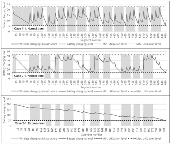 The variation of the battery charging level during their operations in both cases is illustrated in Figure 4. The x-axis of graph means the route that the electric tram uses, whereas the y-axis denotes the battery level of the electric tram. The grey area indicates the segments that installed the wireless charging infrastructure, whereas the black curve represents the variations of the battery charging level during the operations in Case 1-1 and Case 2-1. Therefore, when the black curve passes the gray area, the value increases and decreases repeatedly, which is illustrated in Figure 4. This means the battery is charged in that area, whereas the battery decreases in the white area. The reason the black curve decreases at the chargeable area is because it consumes energy in order to move. The electric tram charges the battery at the white area, and this is due to the regenerative braking. Note that there are maximum and minimum utilization areas of the battery, which are due to its characteristics.