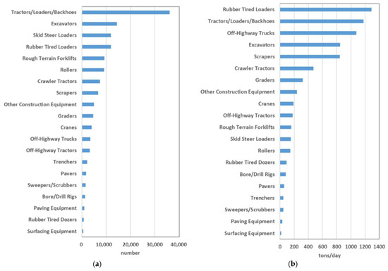 (a) Population and (b) CO2 emission of various construction equipment types in California in 2018 (adapted from [24]).