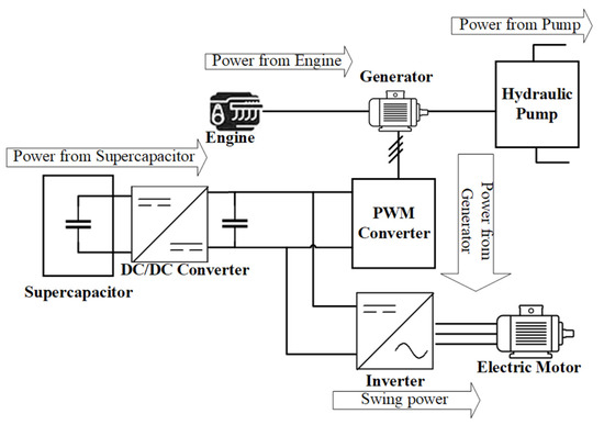Configuration of compound hybrid excavator [20]. The supercapacitor is used as the electrical energy storage system while the electric drivetrain runs the swing electric motor with engine assistance.