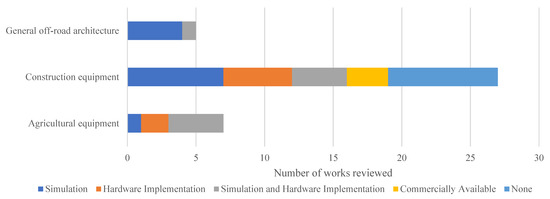 While many publications focus on specific equipment types (e.g., tractors, excavators) or categories (e.g., construction, agriculture), several others are geared toward general, multi-purpose off-road equipment. This section provides an overview of notable works conducted on construction and agricultural equipment electrification, with the additional inclusion of some general off-road equipment types. Each subsection covers different hybrid and battery electric powertrain configurations. A hybrid electric vehicle (HEV) uses electric motor(s) alongside an ICE, while a battery electric vehicle (BEV) employs electric motor(s) exclusively. A separate classification worth mentioning is fuel cell electric vehicle (FCEV), which uses fuel cells to generate electricity for running its electric powertrain. Partial or full electrification of equipment attachments, which conventionally is powered by ICE through PTO, is also discussed in this section. In addition, the maturity level of technology development—software-based simulation or hardware implementation (either on test bench or in vehicle)—is also noted.