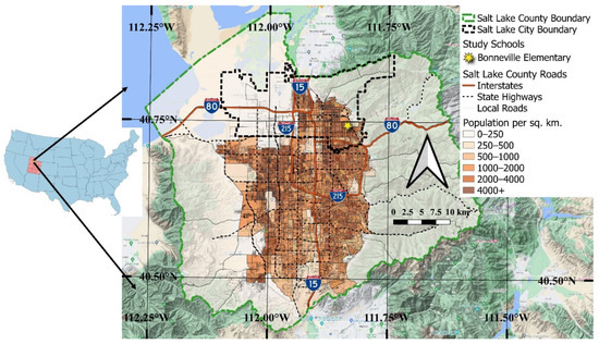 Utah is a state in the rapidly growing American West region of the United States. The complex topography of Utah’s urban valleys, along with its high elevation, increasing population, and associated emissions, causes multiple air quality concerns. In 2021, the American Lung Association ranked SLC as the 12th most polluted city nationwide for ozone pollution and the 17th most polluted city in the U.S. for short-term particulate pollution [39]. Bonneville Elementary School is located in the eastern part of SLC (40.74417 N, −111.83618 W [40], Elevation 1420 MASL [41]).