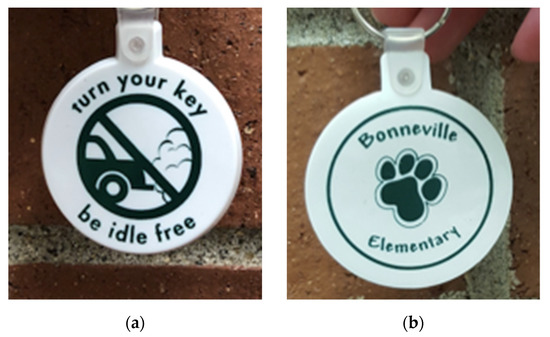 Moreover, during this month, the CAC held their first driver contact event. Eight CAC volunteers approached drivers who were not idling during morning drop-off and afternoon pick-up at the school, thanked them for not idling, and gifted them with a personalized keychain (Figure 2). The keychain had the “Turn your key be idle free” (from the EPA Idle-Free Schools Toolkit) logo on one side (Figure 2a) and the Bonneville Elementary School (Figure 2b) logo on the other side. Keychain costs were covered by the PTA budget. This event was modified from the original EPA Idle-Free Schools Toolkit for a Healthy School Environment to only reach out to drivers who were not idling upon the request of the PTA and CAC members. Therefore, drivers who were idling were not contacted to keep the campaign positive. Artwork submitted on students’ idle-free pledges was turned into yard signs and displayed (Appendix A, Figure A17). Yard sign materials were supplied by the school’s PTA president. Local media outlets were invited to attend the morning drop-off event to spread awareness to the larger community. A second driver contact event was scheduled for mid-April 2020 but was canceled due to the school transitioning to virtual learning in response to the COVID-19 pandemic.