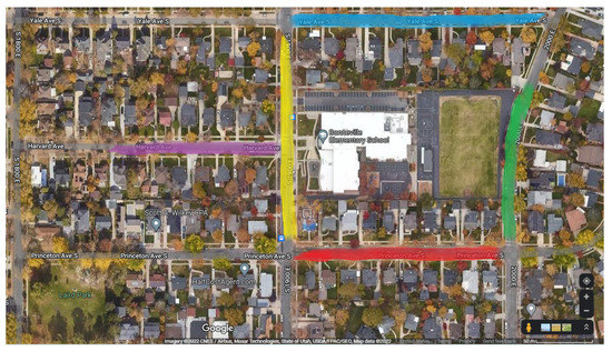 Observations were conducted Monday, 16 September through Friday, 20 September 2019, at five locations (Figure 3) surrounding the school during morning drop-off (8:00 a.m.–8:45 a.m.), afternoon pick-up (2:45 p.m.–3:15 p.m.), and at one location during kindergarten half-day pick up (12:35 p.m.–1:05 p.m.). Only one location (1900 E) was observed during kindergarten half-day pick-up because of the limited number of vehicles picking up at this time. Observation materials and observation records were kept in a locked PTA room and collected daily. Data were then input into Microsoft Excel [52] and analyzed.