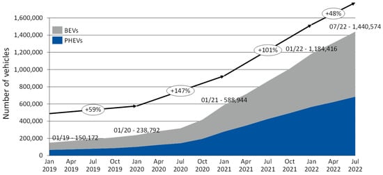 In July 2022, BEVs already had a larger cumulative battery energy than Germany’s pumped hydro storage plants (39 GWh) [1]. If the goal of 15 million BEVs by 2030 of the German government is met, then the cumulative battery energy is likely to reach between 600 GWh (assuming 40 kWh/vehicles) and 1200 GWh (assuming 80 kWh/vehicles). Taking into account a net power consumption in Germany in 2021 of 515 TWh, this accounts for from 43% to 85% of the average daily electrical power consumption. Assuming an average energy consumption of 18 kWh and an average milage of 37 km/day per car, 15 million electric vehicles will consume about 7% of today’s electrical power consumption. The main source of uncertainty in this domain is the market share of PHEVs compared with BEVs. Over the period studied in this paper, the share of PHEVs in the EV segment fluctuated between 41% and 49%, but subsidies for the purchases of PHEVs will end by the end of 2022 [20]. This could start a shift away from PHEVs to BEVs in the overall vehicle fleet. The average battery energy of new EVs could consequently rise, leading to higher fleet values.