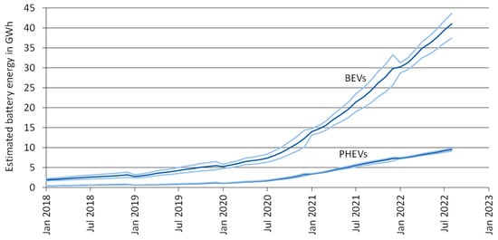 Figure 2 shows the estimated battery energies of BEVs and PHEVs in Germany over time. The fact that the error margin rises over the course of a year results from the fact that the reporting is more detailed on an annual basis as compared with the monthly basis. The intrayear values are further likely slightly overestimated because vehicle deregistrations are only reported on an annual basis. The figure clearly shows that BEVs are the main driver in the EV battery market and should be the focus when innovative business models, such as vehicle-to-grid or vehicle-to-home models, are developed.