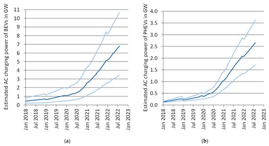 Estimated AC charging powers of (a) BEV fleet and (b) PHEV fleet. The surrounding light-blue lines are the error corridor that results from the fact that the national car registry’s identification system does not differentiate between the charging powers of different car-model versions.