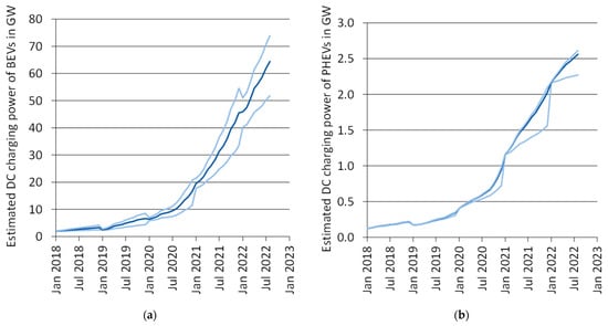 Estimated DC charging powers of (a) BEV fleet and (b) PHEV fleet. The surrounding light-blue lines are the error corridor that results from the fact that the national car registry’s identification system does not differentiate between the charging powers of different versions of a car model.
