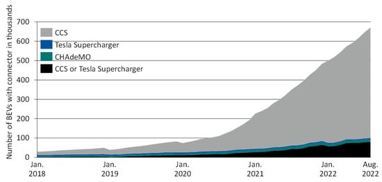Figure 5 shows the number of BEVs by the type of DC fast charger equipped. The combined charging system (CCS) is the predominant connector type for vehicles registered in Germany. This is in line with the EU’s decision to make the CCS plug the default plug, and to enforce a law requiring that every fast charger be equipped with the CCS and only optionally other formats [23].