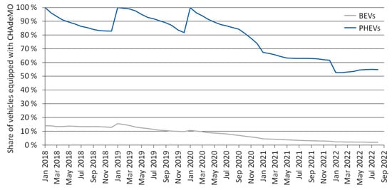 This finding is extended in Figure 6, in which the share of vehicles in the fleet that were equipped with a CHAdeMO (“CHArge de Move”) connector is shown. We decided to show the share of the CCS’ largest competitor, the CHAdeMO, instead of the CCS itself because there is a larger uncertainty for the CCS. The reason for this is that Tesla switched from the proprietary standard to the CCS. Our dataset unfortunately does not allow us to differentiate between the two types of Teslas. The core statement, however, remains correct, as all new Teslas are sold with a CCS plug. Although the CCS was the most popular fast-charging standard in the observed data period, the ratio changed over time. In 2018, the CHAdeMO still had a significant foothold in the market, with 14% of the fast chargers in BEVs being of the CHAdeMO type. This value plummeted to 2% in August 2022. For PHEVs, the CHAdeMO is still a relatively frequent choice, but the overall low number of fast-charging-enabled PHEVs dilutes the picture somewhat: In 2018, our database recorded 4000 PHEVs with a CHAdeMO connector, and until August 2022, this number had only risen to 41,000.