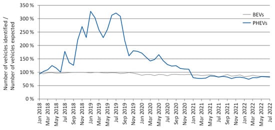 To verify that the chosen data-merging approach is valid, it was important to compare the number of vehicles for which we could assign a TSN and HSN with the number of vehicles that we expected to find according to FZ 1. This check was performed and is presented in Figure 7. As can be seen, the detection rate was from 80% to 100% for BEVs, and from 71% to 171% for PHEVs. The excessively high detection rate of PHEVs can be explained by the fact that some models are sold as PHEVs and internal-combustion-engine vehicles. The results for the PHEVs are therefore subject to uncertainty. As the battery energy and charging power of PHEVs are significantly lower than those of BEVs, the overall market view is likely undisturbed by the somewhat higher inaccuracy for the PHEVs.