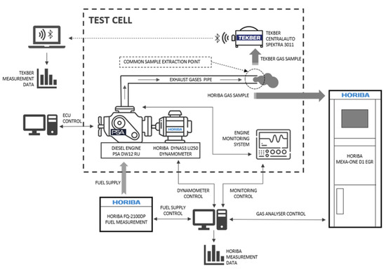 The NOx concentration in the pipe exhaust stream is measured with a gas analyser, and the load demand on the engine is controlled through the OBD system, with the value of “% engine load” provided by the ECU of the vehicle (PID $04 according to SAE J1979/ISO 15031-5) [27].