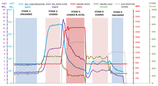 At the same time, the NOx concentration was measured simultaneously by the two gas analysers. The blue-dotted square in Figure 3 shows the five stages described in Figure 2 that correspond to one single Static Idling Internal Load Test.