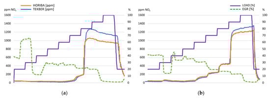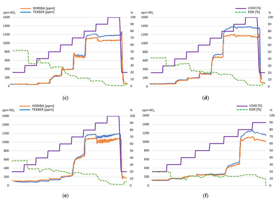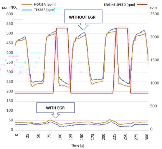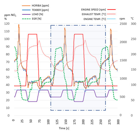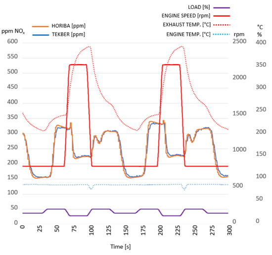 Figure 3 shows one of the tests performed with activated EGR. The purple line represents the load demand on the engine generated by the dynamometer, the red line is the engine speed, the green dotted line is the EGR aperture percentage, and the red and blue dotted lines are the exhaust gas temperature and engine oil temperature, respectively. Finally, the continuous orange line is the NOx concentration (ppm) from the Horiba gas analyser, and the continuous blue line is the NOx concentration (ppm) from the Tekber gas analyser.