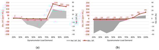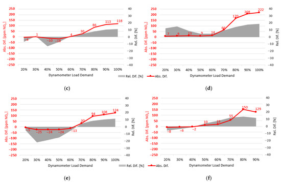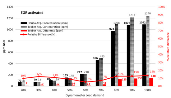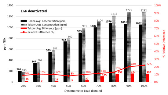A summary of results from the tests performed with a deactivated EGR is shown in Table 3. The values of the absolute and relative differences between the results of both devices were low enough to evaluate the performance of the Tekber analyser as adequate for measuring NOx emissions in PTI.