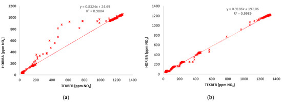 This section shows results from the set of tests performed. Although the Horiba equipment can provide NO, NO2, and NOx values, the Tekber equipment only provides NOx concentration values, so the comparison was made exclusively with the NOx concentration.