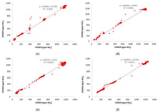 The value of NOx concentration was simultaneously measured with both gas analysers to compare results, assuming the value measured from the Horiba gas analyser as the reference value.