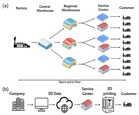 With increased service orientation and product innovation, the aftersales market has gained significantly in the global market. In 2018, Germany’s automotive aftermarket was worth USD 21.5 billion and it is predicted to grow at a compound annual growth rate (CAGR) of 1.1% between 2019 and 2025 [1]. The following products are some of the aftermarket products that are examined primarily for a product innovation strategy: high-capacity engines, electric motors, batteries, lights, and electronic components. To facilitate safe, sustainable transportation, manufacturers and suppliers provide innovative solutions. Plug-in electric car sales have surged globally in recent years as a result of the automotive industry’s move to e-mobility and sustainability. A conventional vehicle typically contains over 2000 components, whereas an electric vehicle includes significantly fewer components. Since the drivetrain is a fundamental component of an automotive, manufacturers will mainly focus on making the parts associated with the drivetrain first. It is expected that the number of parts will fluctuate throughout the forecast period as some companies will devote some of their resources to the creation of EV parts and components. Power inverters, (direct current) DC–DC converters, battery parts, and electrical motor control units are some of the other crucial parts that companies will create in order to remain competitive in the market [2]. The adoption of EV-related spare parts in the aftermarket will be gradual at first but with the sector experiencing a paradigm shift, the rate is predicted to increase significantly within a few years [1]. Automotive companies deal with a number of challenges but the most pressing factors relate to the manufacturing, supply, and storage of spare parts, as shown in Figure 1a. One of the most common issues is the cost of ordering spare components. In order to lower the cost per part, conventional manufacturing creates parts in large quantities. The recent ongoing COVID-19 pandemic has also impacted the spare parts supply chain industry to a large extent globally leaving industries to look at alternate directions [3]. Long lead times are another challenge which is associated with traditional spare part productions. If a customer on the other side of the world needs a spare part, ordering, and shipping it can often take weeks, which negatively impacts his or her satisfaction. Sometimes manufacturers decide to discontinue producing certain spare parts altogether, leaving their consumers without options. Instead of this, an advanced reverse engineering process may be used to convert traditionally manufactured spare parts into AM parts that can be produced on demand if needed. In the modern era, as seen in Figure 1b, 3D printing and digital spare parts management have helped address a lot of these issues. With regard to the “VBER” guidelines, the spare parts distribution management is seen to be complex. Since the market and the buyer–seller construct can be very complex, the authors have decided to present a simplified but meaningful form of spare parts supply chain behaviour for additive parts [3,4,5,6,7].
