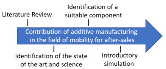 In order to discuss how additive metallic spare parts are already being used in the automotive environment but also to show the potential that arises from additive manufacturing, this study will on the one hand provide a literary introduction to additive spare parts and their technical characteristics as the state-of-the-art and science, and on the other hand, a conventional component that is already in use will be simplified and provided with the advantages of an additive component, and the potential that arises from additive manufacturing will be shown with an introductory simulation. This component is intended as an example of a performance spare part, which is partially improved and installed as a replacement for a damaged original component. Figure 2 illustrates the theoretical research procedure.