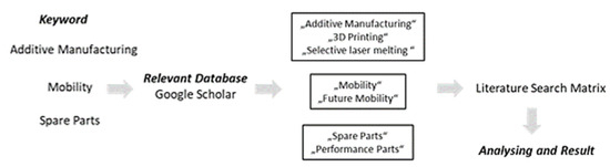 For this purpose, a literature search was carried out using the Google Scholar database. The authors chose this platform because all other subordinate platforms are also searched. The main topics of additive manufacturing, mobility and spare parts were used for the literature search.
