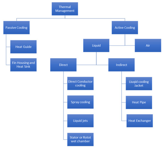 For an electrical machine to function reliably and for a long time, thermal management is critical. This means that more efficient and better cooling capabilities are always needed. Conduction, convection, and radiation are the three processes that extract heat from an electrical machine [32]. Selecting an appropriate cooling system to optimise the convection effect is critical in order to limit the temperature of the machine’s critical parameters. Thermal management on a machine is separated into two primary approaches and various sub-methods. Despite being more expensive, active cooling provides a substantially better cooling solution. The most dependable and least expensive method is passive cooling. Because of advancements in manufacturing technology, current solutions have grown more efficient. AM has various advantages for enhancing EM cooling capabilities, including decreasing weight, optimising forms and geometries, and eliminating assembly constraints. Figure 4 shows the thermal management methods for electrical machines [2].